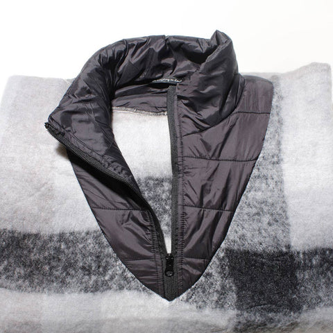 Women's Black Plaid Print Long Fringe Poncho Featuring Quilted Puffy Half Zip Neckline. Bottom Fringe Detail. One Size. 31.5" x 51.2". Soft Knit Fleece-Like Material. 100% Acrylic.
